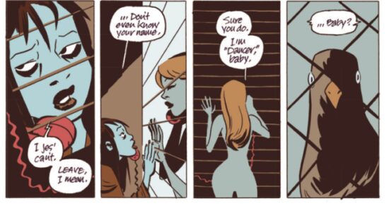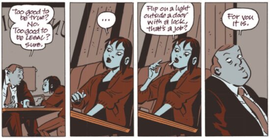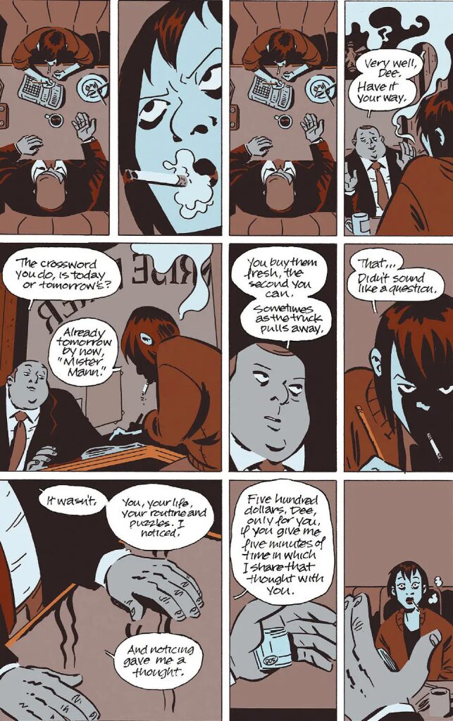 And each subplot has a different colour palate: the first is brown and pale blue, the second is teal and grey, then yellow and mustard, then solidly grey, and finally returning to brown and blue. The colours are sickly and surreal: there are no skin tones. It is as if the hues of the city have etched themselves into the skin of the characters. This is the mastery of veteran colourist Matt Hollingsworth, whose skills we first bewitched by on Marvel Comics’ Hawkeye which he worked on with Mr Fraction in 2012.