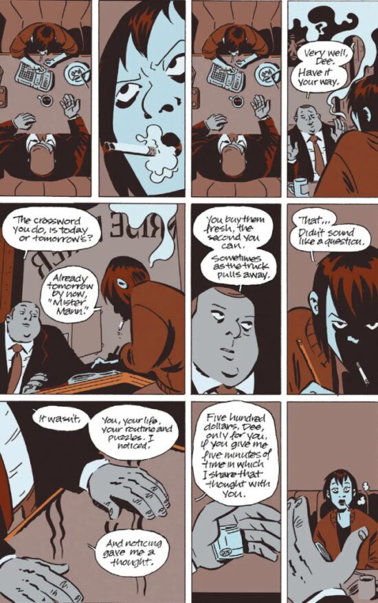 A woman called Dee is the main player in the initial and final “brown and pale blue” subplot. Dee is thoroughly washed up. She has a compulsion to complete puzzles and crosswords. Apparently as a consequence of this, Dee is recruited by a mysterious man – “Mr Mann”- who knows far too much about her. This anonymous player barely masks his intimidating presence beneath casual chatter and a cigarette. He wishes Dee to participate in a strange routine: the morning delivery of a code by old fashioned radio broadcast, in exchange for which she will be paid significant sums of money.