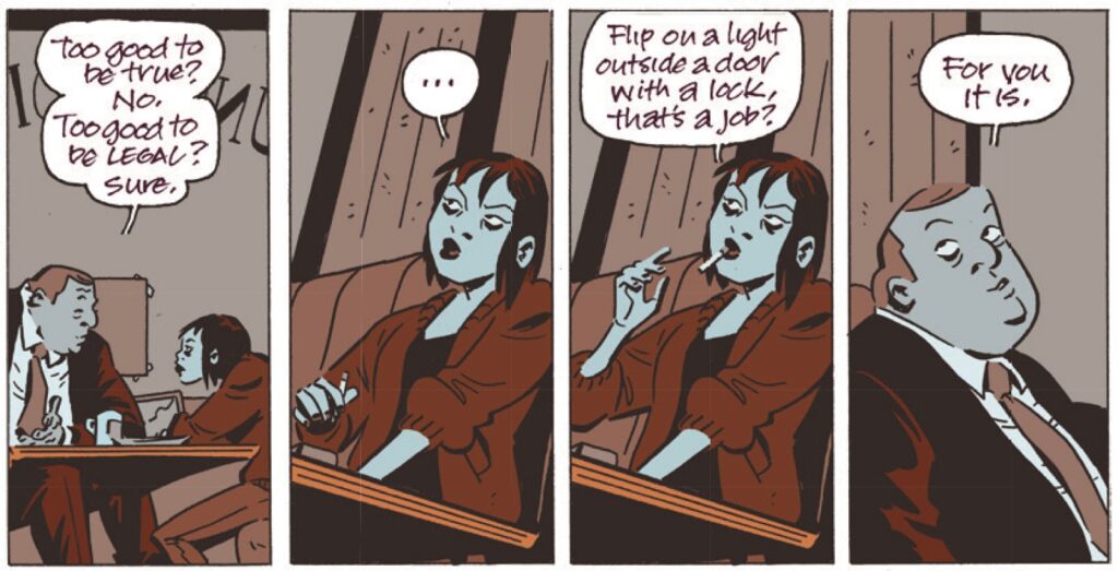 The code appears in a newspaper, she uses a key to de-cypher it, and she broadcasts the de-cyphered words. The very first time we see Dee broadcasting the code, it is an enigma. “Tango, Seven, Dutch, Eleven, Widow, Nine, Foxtrot”. It means nothing to us, and nothing to Dee, but it means a lot to someone, somewhere else. “Why, what do you do for a living?” Dee churlishly asks the reader, after she burns the code and exits the rooftop pigeon enclosure hiding the radio equipment. Dee can’t dispose of the cash fast enough. The burden of it leads her to heavy drinking and consorting with strippers. She is lonely and just wants to talk: the strippers are only interested in the hustle.