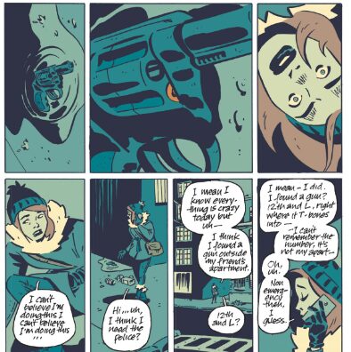 The second teal and grey subplot concerns a gun in a puddle. It is short and brutal vignette, concerned with a well-meaning bystander to the action who finds an abandoned revolver in the street. Sticking her neck out and doing the right thing leads to her abduction by police officers.