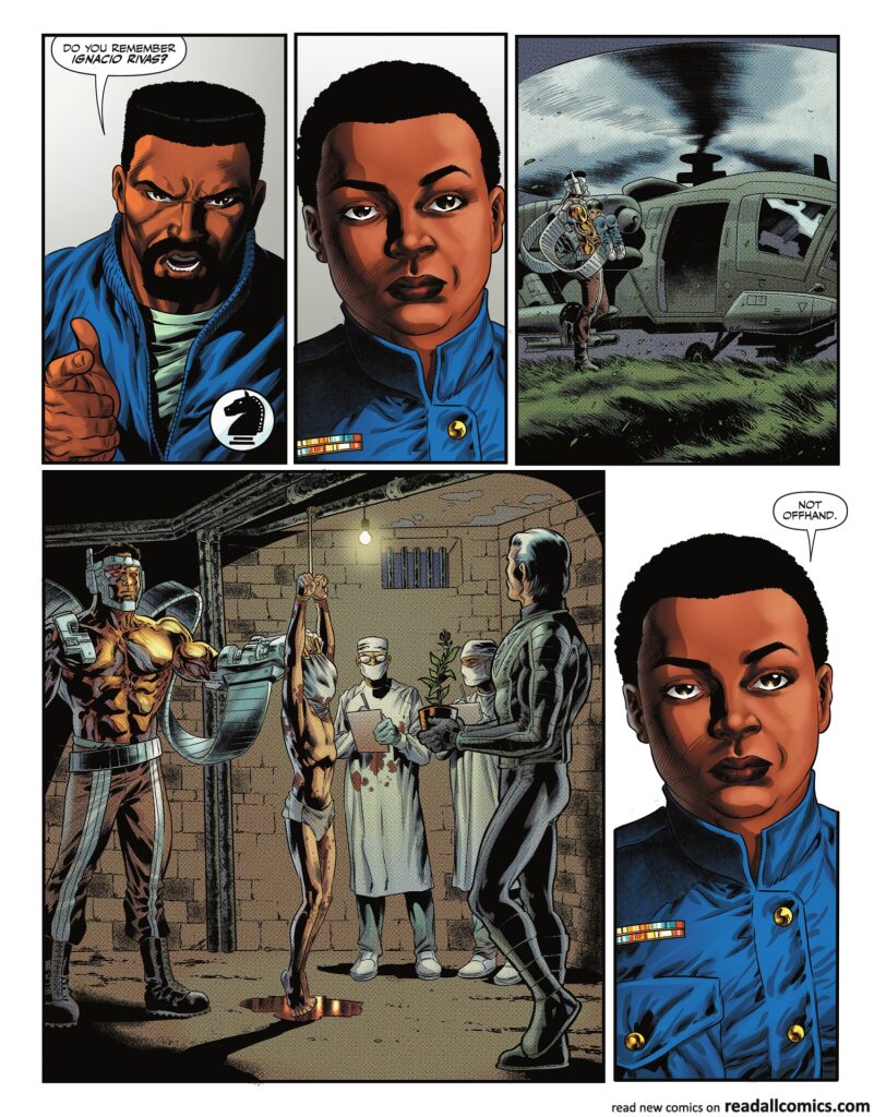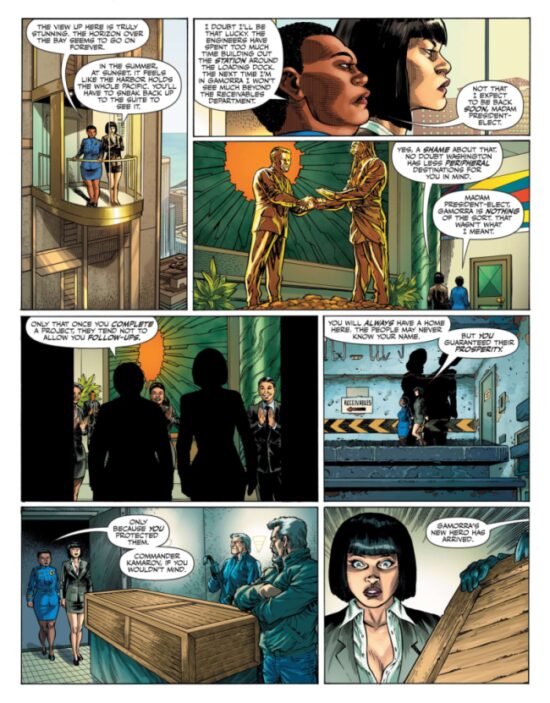 A significant of the problem is that the reader is understood by the creative team to recognise the recycled Wildstorm elements within the story. Many of these are more than just faded away – they are completely obscure. The President-elect of the island-nation of Gamora (a fantasy twin of Singapore, created by Warren Ellis for Wildstorm Comics in the 1990s) is gifted a Cybernary suit by the US government. “A what?” you might ask, and fair enough. Cybernary was an under-dressed cybernetic character from Wildstorm Comics, created in 1995, and the subject of two failed miniseries (1996 and 2001). It must have taken a shovel, a pick axe and a spotlight to have dredged this concept up from the muck. Similarly, Deathtrap and the MERCs have not seen the light of day in decades.