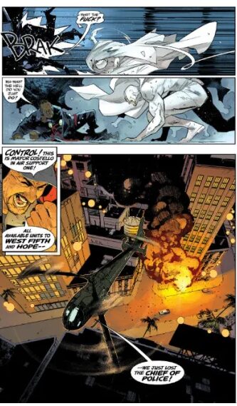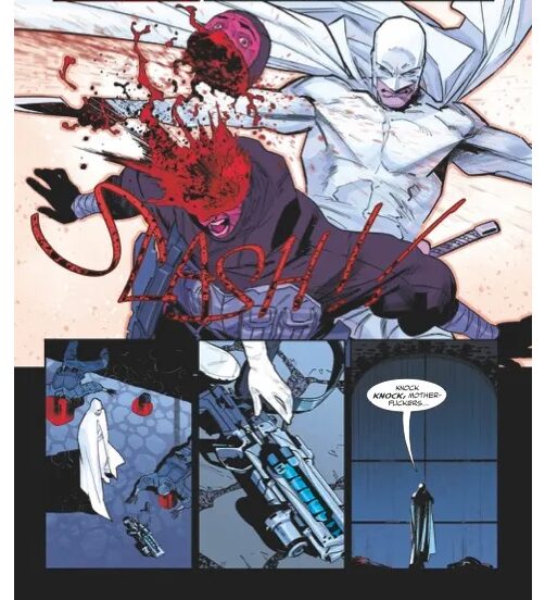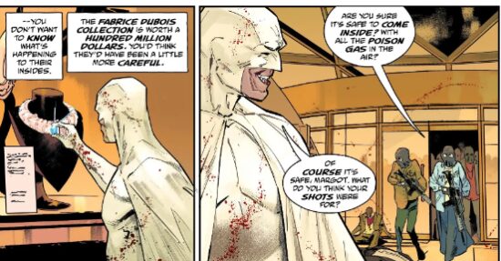 Artist Jorge Jiménez is well-known for his work on DC Comics’ Batman titles and his work in flickering between dynamic action and the quiet of the hunter is masterful. As we discussed in our review of 2011’s Nemesis, the only daylight between Batman and Nemesis is psychopathy and a different coloured costume. Mr Jiménez’ involvement in this title makes that distinction even less obvious. In our view, bringing Mr Jiménez into the book was a clever piece of storytelling by Mr Millar. Mr Millar invites us to see Nemesis as merely an alternative version of Batman, down to the choice of artist. Batman, of course, would never eviscerate his opponents in the way Nemesis does, but squint your eyes – the visual difference is not obvious at all: