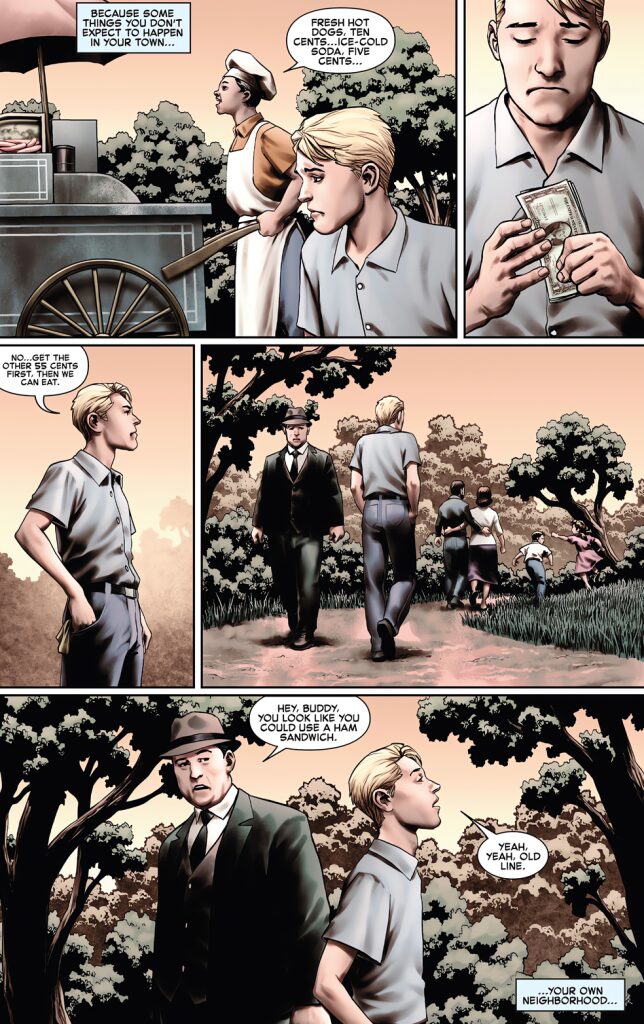 Towards the end of this first issue, bouncing back to 1936, Rogers is directed by a stranger to a nearby rally. The rally is being held by the German American Bund, the American arm of the Nazi Party. It is an uncomfortable piece of American history that, prior to the war, Nazism was a popular ideology in the US. Seeing the Nazi swastika lined up to the American flag even in a mainstream comic is a startling sight to the modern reader, but not so much to the citizens of pre-war America. It seems Mr Straczynski is keen to explore the factors leading to Rogers’ impeccable moral compass.