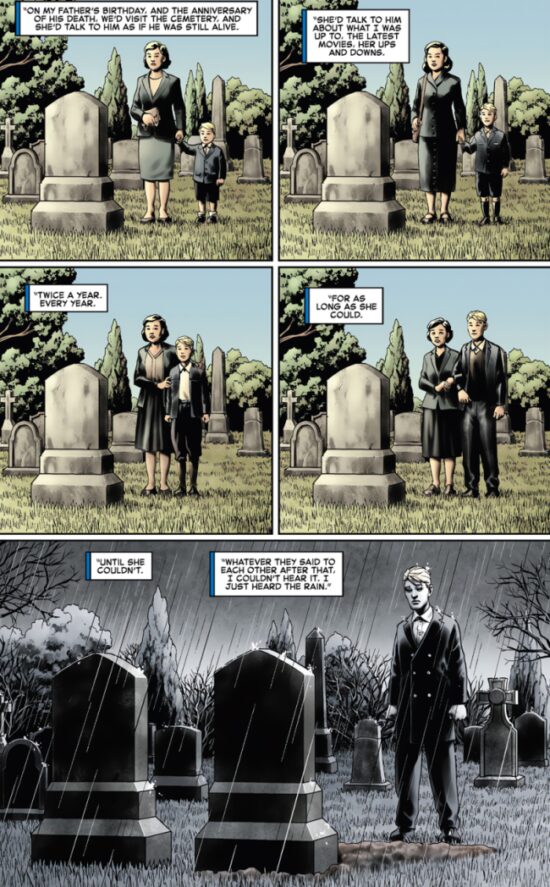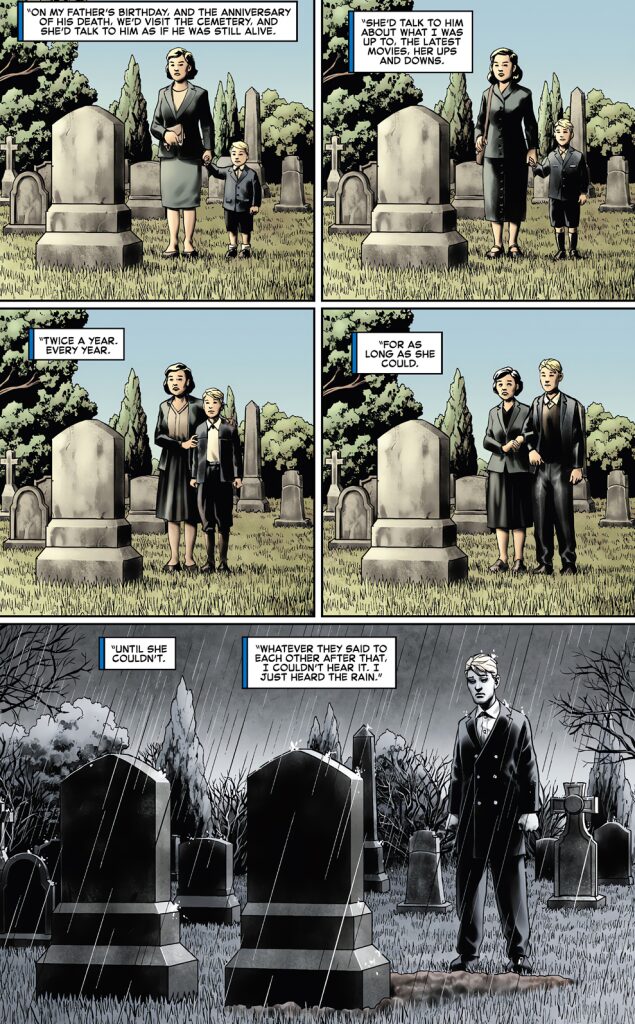 The adult Rogers, who in other moments is the superhero with the indestructible shield, looks up at the window, and in the next panel, wipes a tear. The American dream should not involve an orphaned boy, starving and sleeping alone in a ruined factory. It is heart-tugging, and a remarkable scene from Mr Straczynski and artist Jesus Saiz. (Mr Straczynski has been preoccupied with the plight of the homeless for a long time, writing the comic book title Midnight Nation in 2000-2002. Part of the premise of Midnight Nation was that the homeless, ignored and shunned by passers-by, eventually disappear into a shadow land.)