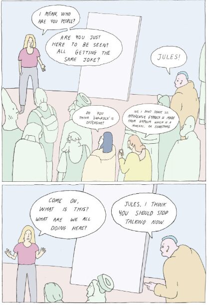 The three main characters are Jules, Stacey, and Sam. There is also Ryan, who is a truly unpleasant individual, and other secondary players. The art itself is simple and often bereft of detail, and Mr Christie uses colour only to highlight characters who are part of a conversation. The figures comprising people in the background are grey, and often look like statutes, accentuated by the fact that much of the action occurs in at galleries. When they enter a conversation, they are lit up in colour, as if a stagehand has swung a spotlight on them.