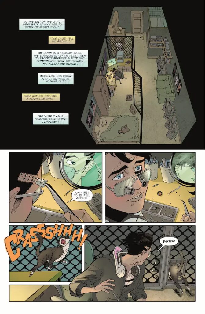 The main character is Soro, a white hat hacker who works for a company called Prophesy Inc. Soro is the subject of a violent assault, which occurs while he is testing a prototype chip upon himself. Soro’s synapses are jarred, and the chip causes him to be to perceive and manipulate electromagnetic radiation. In this future world, where almost everyone is riddled with circuitry, artist Rafael Romeo Magat (whose work on this title is excellent – his perspectives can be grand or intimate as required) renders this as visible to Soro in the form blue waves of ordered energy. But Soro, devastated by the death of his cat, named Baxter, is no lime-green code-perceiving Christ-figure like Neo from The Matrix motion pictures. Soro is more a vengeful, post-modern demon, precisely the wrong person to be gifted with the ability to manipulate electromagnetism.