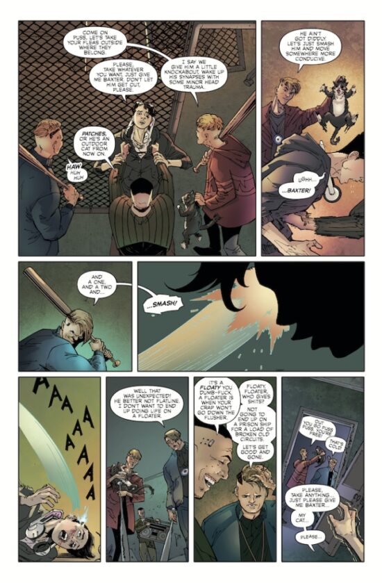 The main character is Soro, a white hat hacker who works for a company called Prophesy Inc. Soro is the subject of a violent assault, which occurs while he is testing a prototype chip upon himself. Soro’s synapses are jarred, and the chip causes him to be to perceive and manipulate electromagnetic radiation. In this future world, where almost everyone is riddled with circuitry, artist Rafael Romeo Magat (whose work on this title is excellent – his perspectives can be grand or intimate as required) renders this as visible to Soro in the form blue waves of ordered energy. But Soro, devastated by the death of his cat, named Baxter, is no lime-green code-perceiving Christ-figure like Neo from The Matrix motion pictures. Soro is more a vengeful, post-modern demon, precisely the wrong person to be gifted with the ability to manipulate electromagnetism.