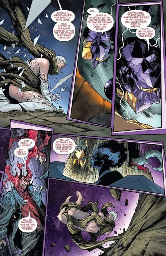 Having navigated the journey and lead ahead of the queue of supplicants by a being called The Preordained, Aiko makes her case. She does not expect the response. “You think justice is erasing your sin? It is not,” thunders the Tribunal from his mountain throne, as hands made of rocks force Aiko to the ground. It is an awe-inspiring scene rendered by artist Valerio Schiti. The Tribunal is visually hard to comprehend, a floating head of amethyst and gold on top of a giant carapace vaguely resembling the human form. The Preordained rides a golden snake made of prisms, with all of the symbology that image invokes. Aiko is pounded into the stone on her knees, and rendered vulnerable as her clothes are stripped from her. Triangular shards fly around her, with the implicit danger of broken glass. Mr Schiti depicts cosmic grandeur with enormous skill.