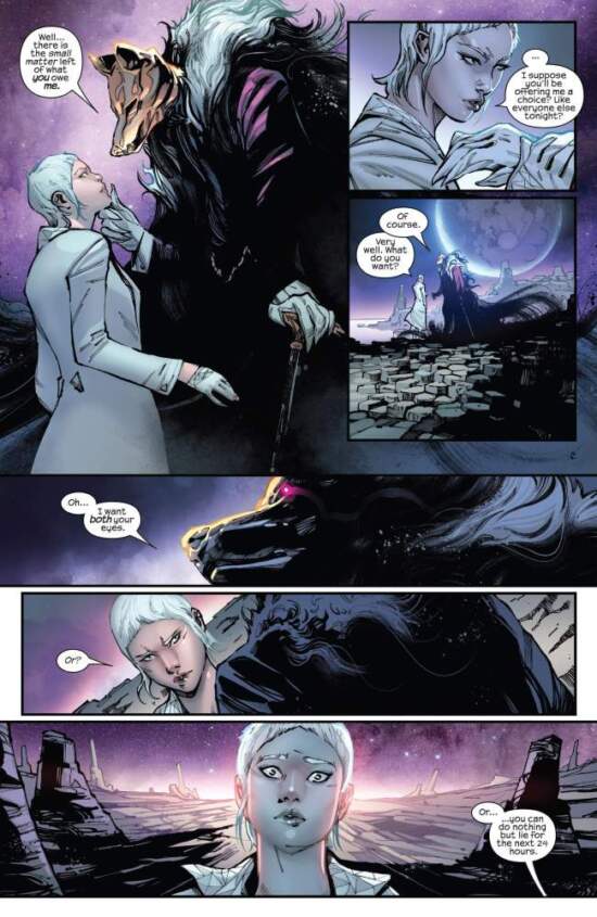 Facing the judgment of the Living Tribunal is not where it ends of Aiko. The Tribunal’s shadow brother, Oblivion, makes Aiko a horrible deal: what has been done to Mia will be undone, but Mia will in turn serve Oblivion. Aiko refuses. Oblivion finds her rejection of the deal amusing: it will happen anyway. Aiko is cast away. The Lion of Wolves notes upon Aiko’s return to his side, humiliated and alive only on a whim, that the episode went much better than he expected. The Lion is not being wry, we think. It is instead a statement of fact.