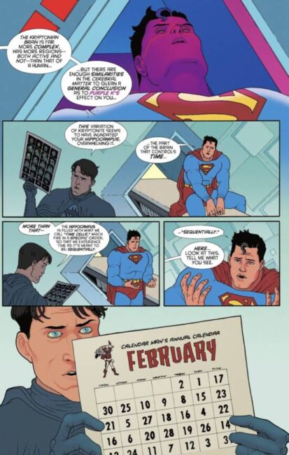 Mr Morazzo’s art assists in the esoteric story. Batman actually looks like a man wearing a mask, his head proportionate to his body rather than fused into his shoulders in, say, the fan-favourite style of Jim Lee. Some people won’t like it because it is not fashionable and gives Superman: The Kryptonite Spectrum a sense of being an alternative / indie title. But Mr Morazzo steals the show with his use of jumbled panels to demonstrate the effect of purple kryptonite upon Superman. The radioactive material scrambles Superman’s perception of time, and as the reader we share in this confusion. Some of the experience of time flickers into the far future, including Superman being (inevitably) attacked by Luthor, and Lois Lane, in her 40s and at a restaurant, announcing that she is leaving Superman.