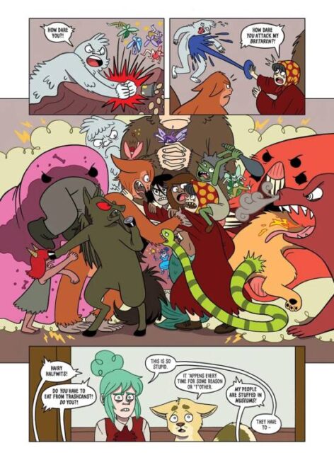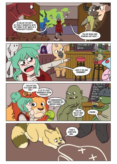 At first glance, Who Killed Nessie? comes off as light-hearted, but do not be deceived. Rachael Smith’s art style, bright and expressive, recalls the look of modern animated shows aimed at younger audiences, but the book is far from a simple comedic romp. Underneath the quirky humor is a layered narrative that plays around with identity, self-perception, and the tension between myth and modernity. Mr Cornell’s writing contrasts the terrifying reputations of the creatures with their all-too-human flaws and neuroses. These terrifying creatures of legend tend to bicker, gossip, and suffer from the same insecurities as the people who fear them.