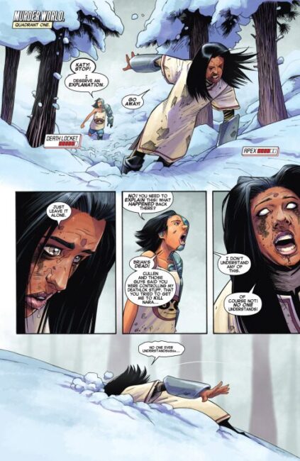 - Apex, the most Machiavellian of characters who is possesses two personalities of different genders in the same body (kind of) is killed by Beckie Ryker (Death Locket), a terrified young girl who has been transformed into a killer cyborg known as a Deathlok by her insane father.