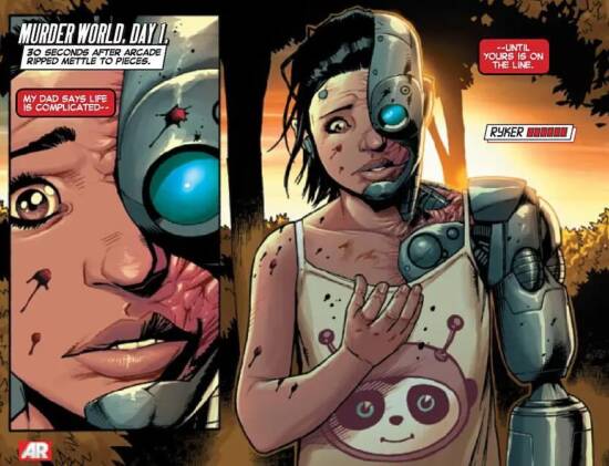 But in our mind, this is Death Locket’s story. Beckie was once a young girl who liked swimming, until a Deathlok from the future killed her mother and maimed her in a failed attempt to kill her father. As one of Arcade’s odds-on favourites to survive the conflict simply by reason of her mechanical additions (we cannot call them “enhancements” because they are too horrible), Death Locket’s story is filled with terror, betrayal, and finally, brutal decision-making on Apex’s fate. (There are some similarities between Death Locket and the Marvel Cinematic Universe’s Taskmaster – both are terribly scarred as a consequence of an assassination attempt upon their respective fathers, both are physically controlled by puppet-masters.) Death Locket’s story is to do with the destruction of Beckie’s innocence, and it is a miserable thing to watch it unfold. Beckie’s singlet is symbolises her descent. At the beginning of the story, it is clear and features a quirky panda. By the end, it is soaked in splattered blood. (It is a shame that, in the sequel Avengers: Undercover, and in subsequent titles, Marvel Comics succumbed to temptation to make Death Locket a villain.)