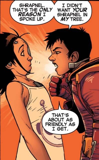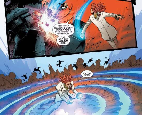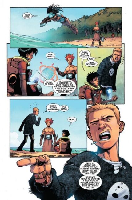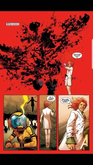 This title is not just an exciting read because of the ugly casualty rate. It is also how the characters react to the danger. The art by Kev Walker is not just concerned with the plentiful action scenes. It is captivating because of the expressions – the teens’ faces and body language plainly exhibit uncertainty, frustration, mania, horror. Some are on their toes: Cammi, a young girl who was involved the with intergalactic team Guardians of the Galaxy, is very capable and out to survive. Apex is out to capitalise on the chaos. Hazmat was saved by the sacrifice of her boyfriend Mettle in the first issue, and then goes into a state of complete denial and spends several days sunbaking on a beach. Death Locket, built to survive a nuclear war, is in constant distress, unable to cope with what is going on, and is manipulated by Apex. Nara surprises herself at the end of her life through self-sacrifice. The dialogue is smart, too, with some of the best lines reserved for the deeply sardonic Cammi.
