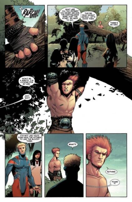 - the insufferable Kid Briton, an alternative universe version of Captain Britain, is decapitated during an argument by the axe-wielding reincarnated Celtic warrior named Anachronism;