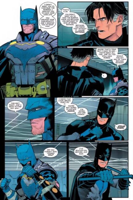 But to our surprise, Knightfight is something different. Batman’s psyche has been probed in a multitude of ways over the years. (Is he a clinically depressed billionaire with a sadomasochistic fetish to beat up poor people? Is he an orphan who throws his child army into the sort of danger which led to his parents being killed in Crime Alley? Did he actually eat rats in his stinking cave?) Here, though, Batman is being repeatedly told that he is not actually Batman: that either he has been replaced by Nightwing in issue 1, or that he is Clayface by Red Hood in issue 2. Batman’s grip on reality is repeatedly shaken, in different ways, by those closest to him. “Do you even know yourself anymore, Bruce?” asks Grayson. And Jason Todd: “Listen to yourself? Yelling at the sky?!”