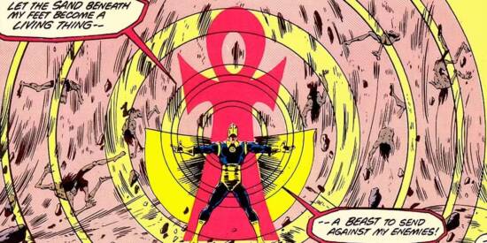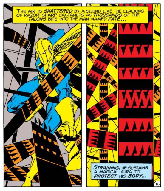 So, when I was doing Doctor Fate, I was trying to develop an alternative way to visualize structured magic. It grew out of my admiration for what Steve [Ditko] had done, of course, and owed a lot to it, but I was searching for a different visual basis. In the end, I came up with the idea of using the ankh as a symbol for Doctor Fate, the Egyptian symbol for life, which seemed appropriate for the character. And I used typography as my structure the way I’d learned at RISD, where we’d extract a letter from a specific typeface, and then play with it, make it a design element. We’d use it as a building block and make circles and spirals, geometric shapes, anything the form suggested. It was really a kind of play and exploration. And you discover negative space and positive space in ways you haven’t seen before and can build on. It must have worked out okay because everybody who’s drawn Fate since has used the ankh.