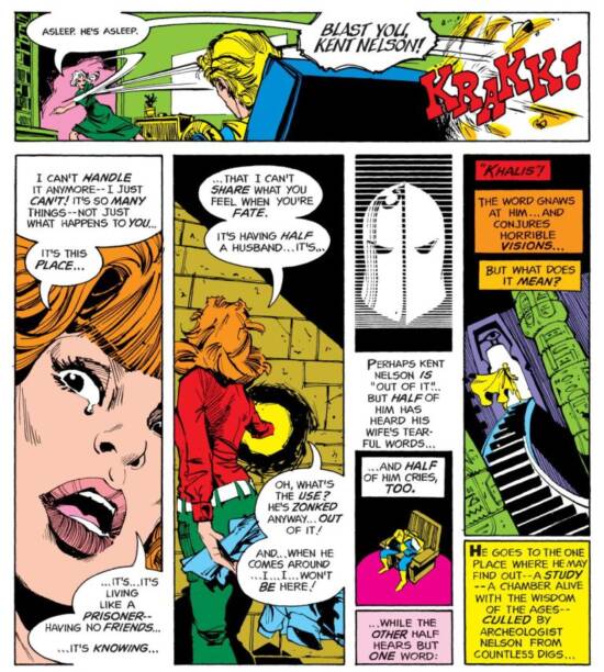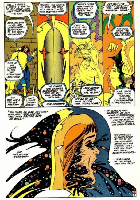 What the abstraction called ‘Dr. Fate’ really came from Walt’s pitch about Lords of Order, which was in response to my idea that Nelson should be just the guy whose body was used by an incorporeal entity that lived inside the helmet (thus providing a rationale for why a helmet at all). Nelson would be presumably only one of many people in history to serve as the “host vessel,” though we never explicitly stated so. This meant that Kent wasn’t being insensitive to his wife’s plight; he was simply powerless to ignore the call to service from the thing in the helmet.
