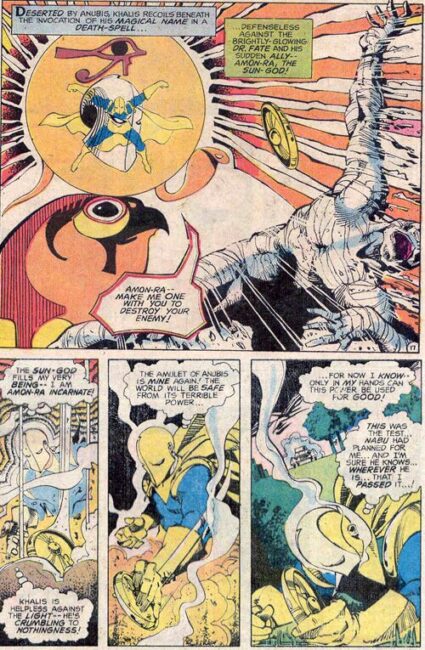 The story itself has the titular character fight, first, a revived mummy named Khalis seeking Dr Fate’s Amulet of Anubis; second, a malevolent Aztec god accidentally released from an ancient artefact; and third, a rogue Lord of Order acting in conjunction with a nightmarish Lord of Chaos called Vandaemon. (The satisfying twist in the Khalis storyline is that he died in service to the Egyptian god of death, Anubis, but upon being called back to life finds to his disbelief that Anubis has forgotten him and regards him with contempt. Gods are fickle.) These plots are exciting, fun, and each adversary seems to pose a genuine threat to a character often depicted as a nigh-unbeatable superhero.
